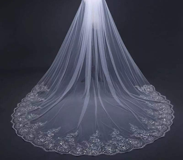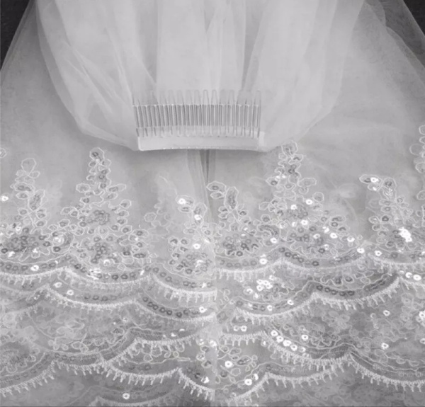 Velo  estilo catedral con encaje de boda largo y lujoso con lentejuelas blanco marfil, una capa con peine 3 mts. $60